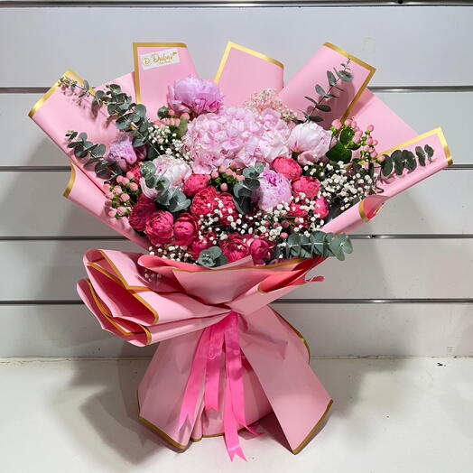 pink peony - 5 pcs pink hydrangea - 1 pcs hypercum - 4 pcs filter - 3 pcs garden type roses - 4 pcs