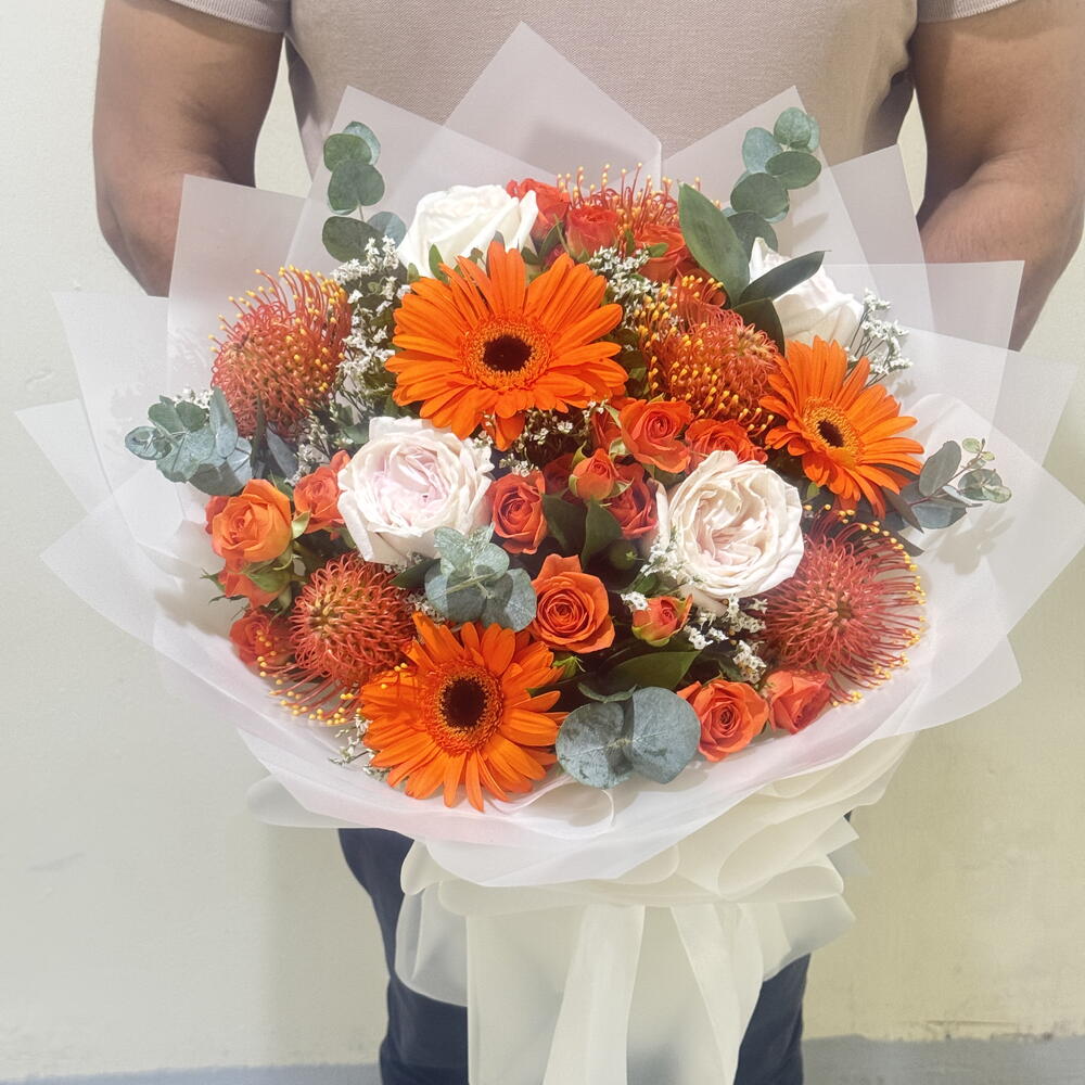 Gerbera - 3 pcs leucospermum - 5 pcs ohara - 4 pcs oange spray roses - 4 pcs