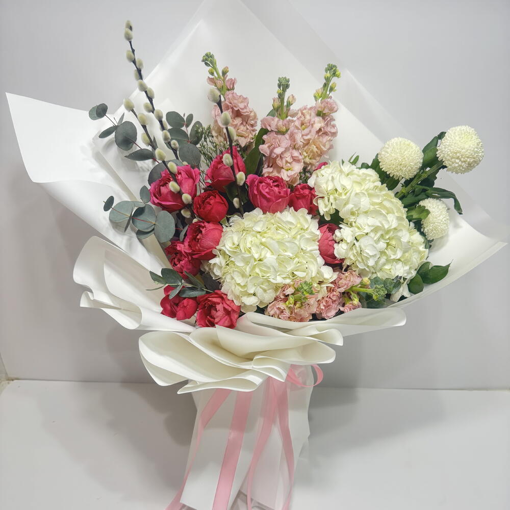 Hydrangea - 3 pcs garden type spray rose - 5 pcs matholia - 5 pcs ping pong chrysanthemum - 4 pcs