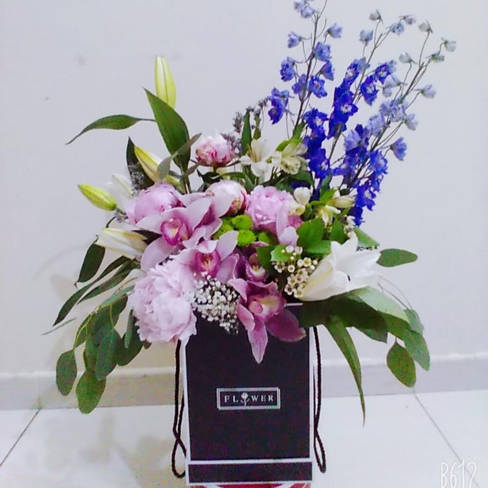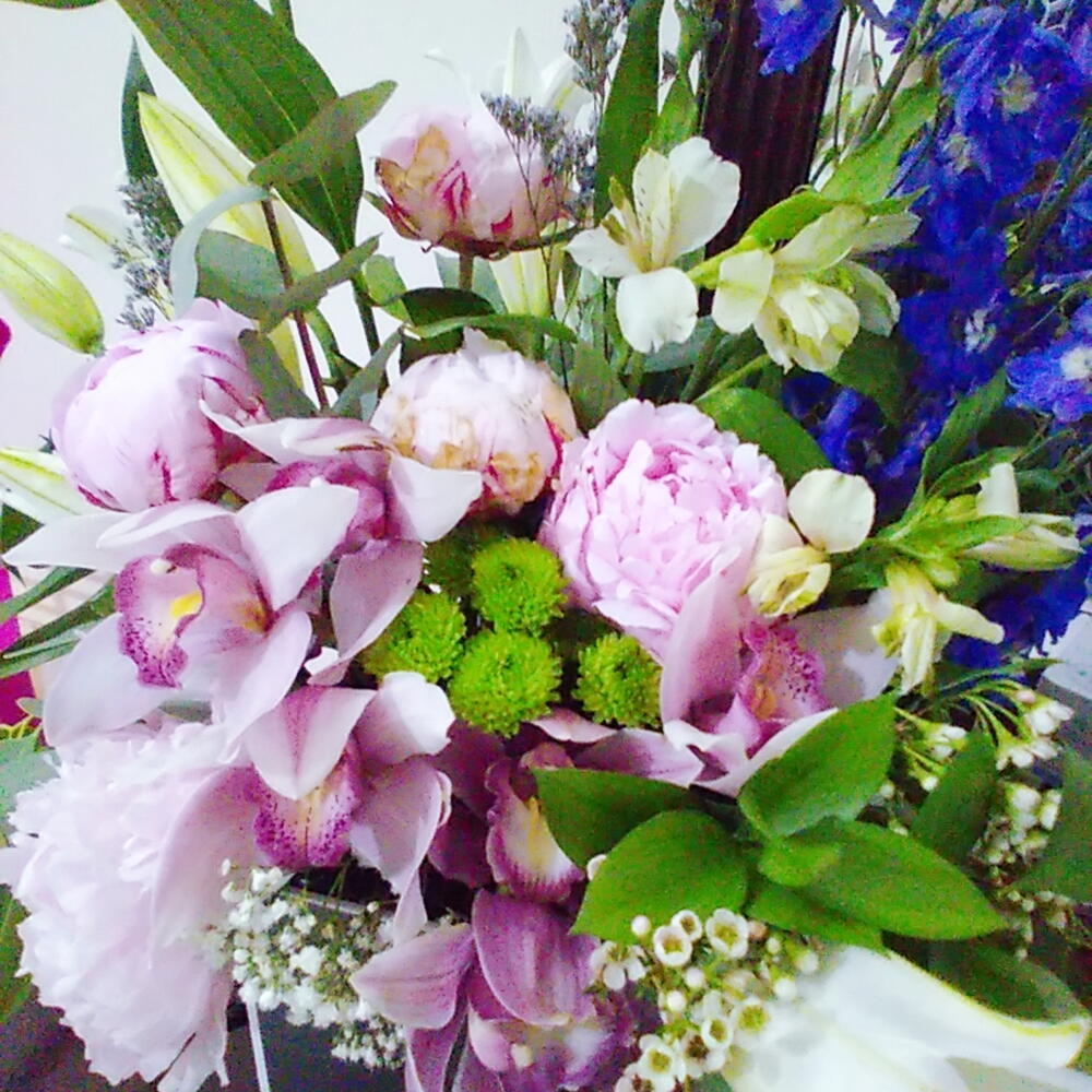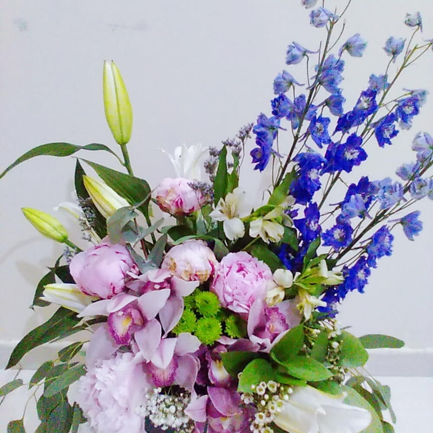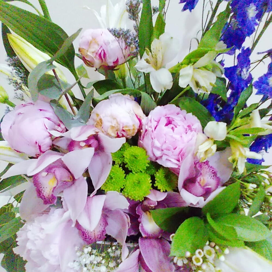 cymbidium - 4 pcs delphiniums - 4 pcs pink peony - 5 pcs white lily - 2 pcs
