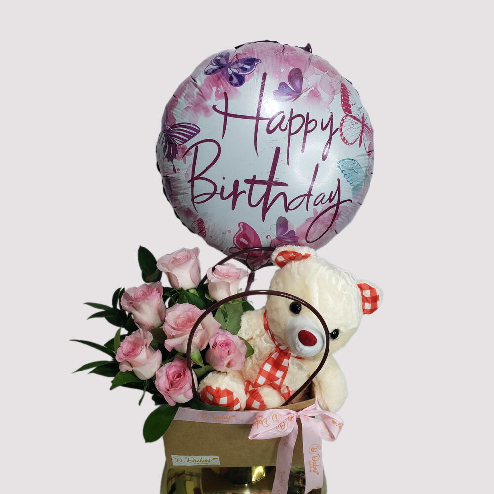 Teddy bear - 1 pcs pink roses - 8 pcs foil balloon - 1 pcs filter green - 2 pcs