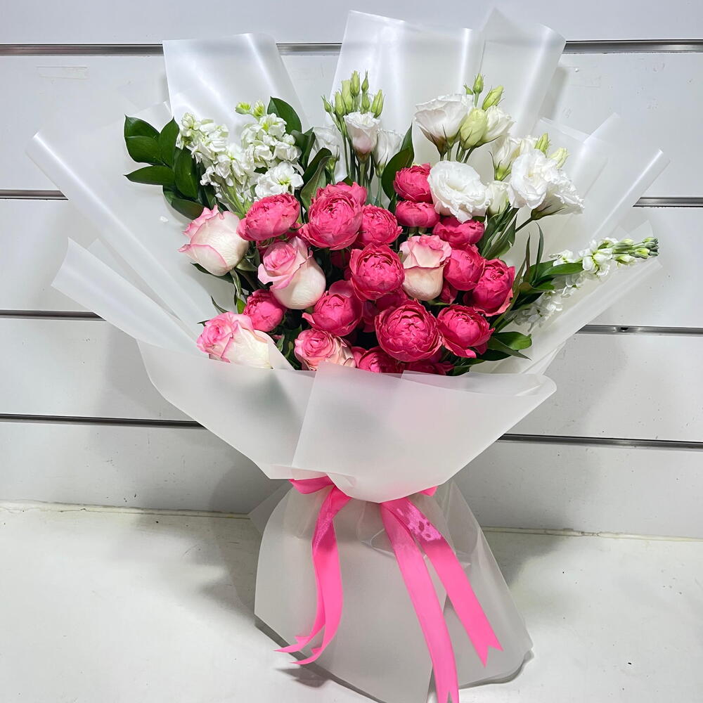 lisanthus - 3 pcs garden spray roses - 4 pcs double shade pink roses - 5 pcs metholi - 3 pcs