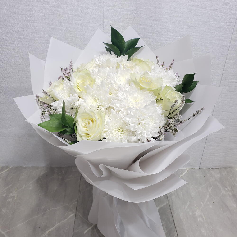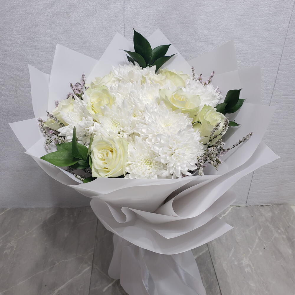 white chrysanthemum - 5 pcs rescus - 3 pcs white roses - 6 pcs