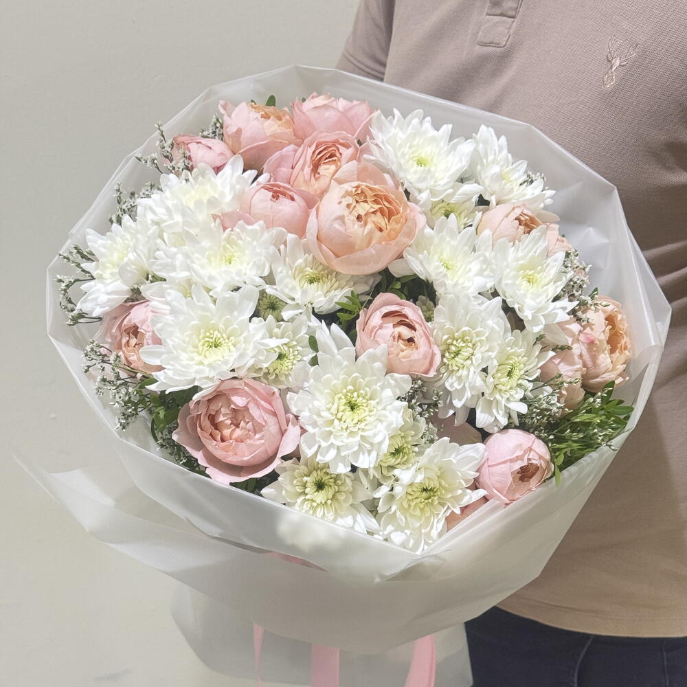 white chrysanthemum - 5 pcs garden type roses - 5 pcs