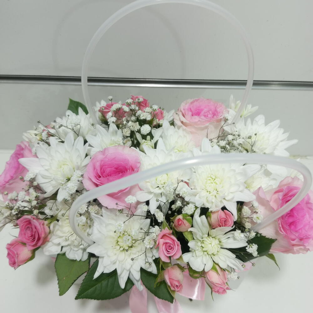 Pink rose - 5 pcs pink spray rose - 3 pcs baby breath - 2 pcs white chrysanthemum - 2 pcs
