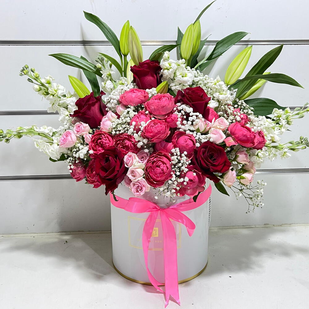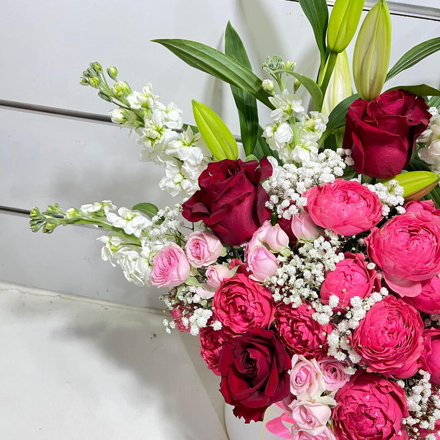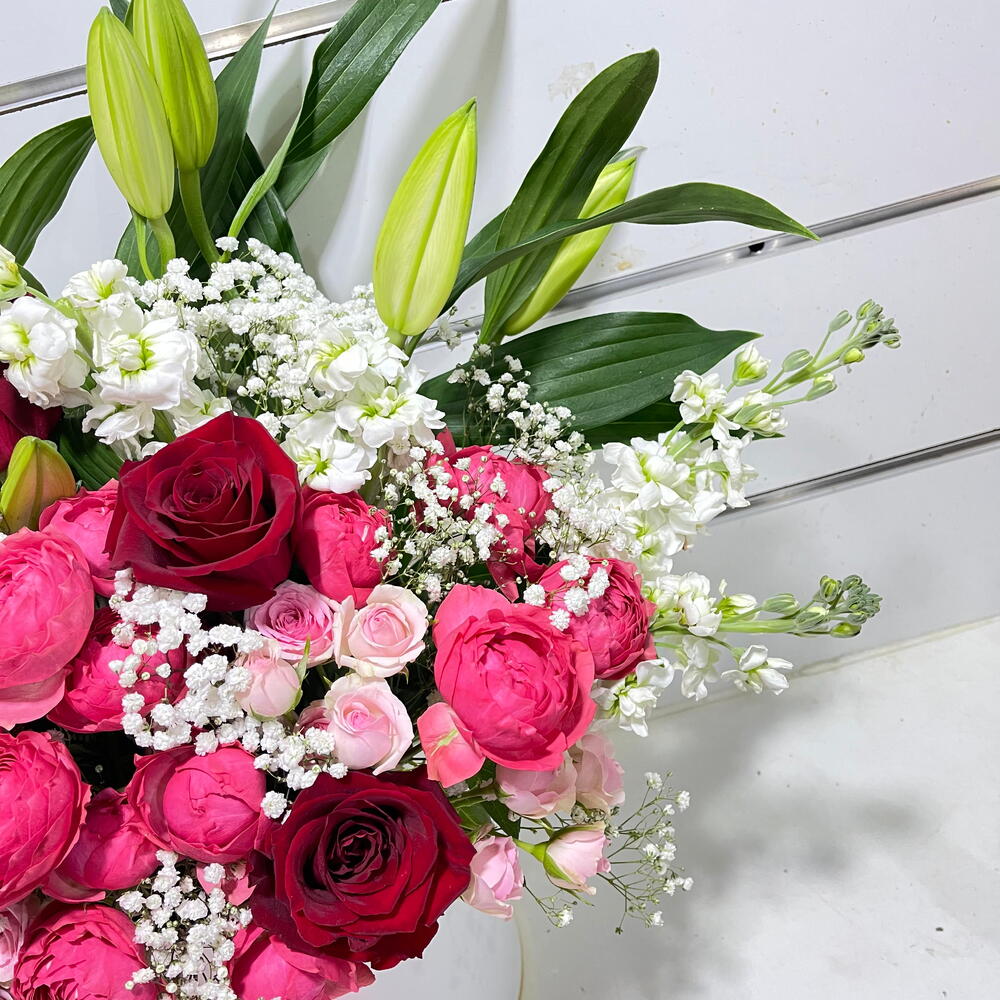 white lily - 4 pcs red roses - 5 pcs pink spray roses - 3 pcs garden type spray rose - 4 pcs metholi white - 4 pcs
