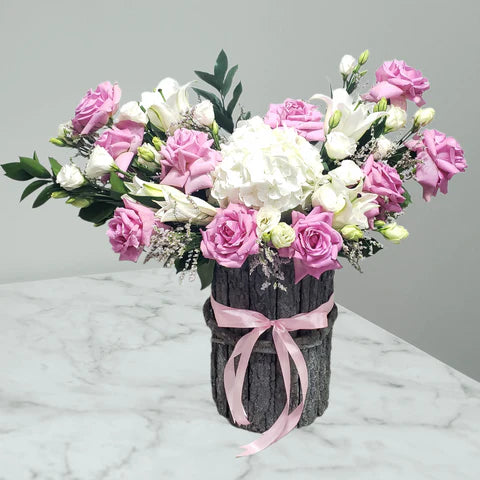 A graceful arrangement of light pink roses, white hydrangeas, and delicate white lilies, accented with soft greenery, creates a stunning blend of romance and elegance. Housed in a rustic bark-style vase with a delicate pink ribbon, this bouquet exudes both natural charm and refined beauty. Perfect for adding a touch of rustic sophistication to any occasion.