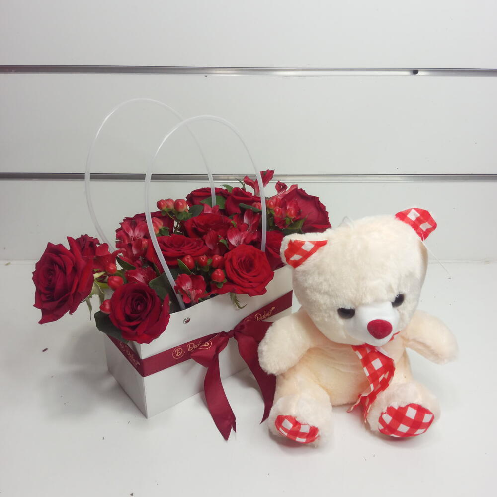 Red rose - 10 pcs Alstroemeria - 4 pcs Teddy bear - 1 pcs hypercum - 5 pcs